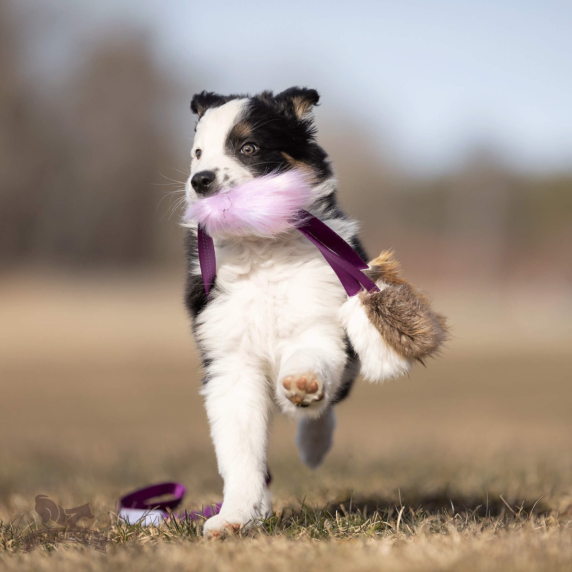 En bläckfiskjagare med tre olika äkta pälsar för den lilla hunden eller valpen! Leksaken består av ett långt handtag, som kan fås med eller utan elastiskt, som bjuder in till roliga jaktlekar, samt tre fladdriga "armar" som lockar igång hunden. En av armarna är med mjukt och tåligt bäverskinn, en är med fluffigt rävskinn från svenska rävar och en är med lockande kaninskinn från svenska kaniner.